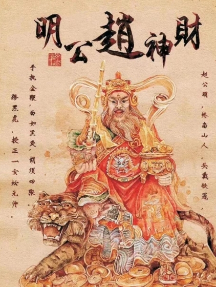 在中国传统民俗文化与道教信仰中,财神是备受尊崇的神祇之一,掌管着世间的财富与福运。财神分为文武两类,其中武财神以赵公明最为著名。赵公明,本名朗,字公明,又称赵玄坛、赵公元帅,其形象威猛,手持金鞭,坐骑黑虎,既能驱邪镇宅,又能招财纳福。一、武财神赵公明的由来与神职赵公明的信仰源于道教神话体系,其形象在多部典籍中均有记载。《封神演义》中,赵公明为截教门人,精通道法,后助商伐周,虽败于陆压道人的钉头七箭书,死后却被姜子牙封为“金龙如意正一龙虎玄坛真君”,统领招宝天尊萧升、纳珍天尊曹宝、招财使者陈九公、