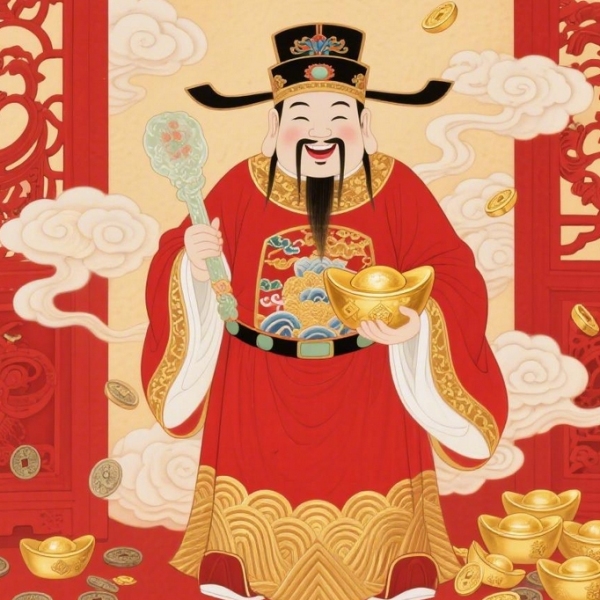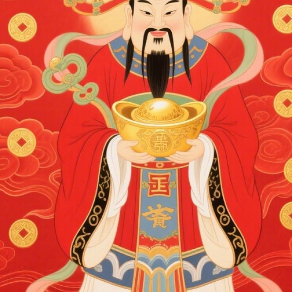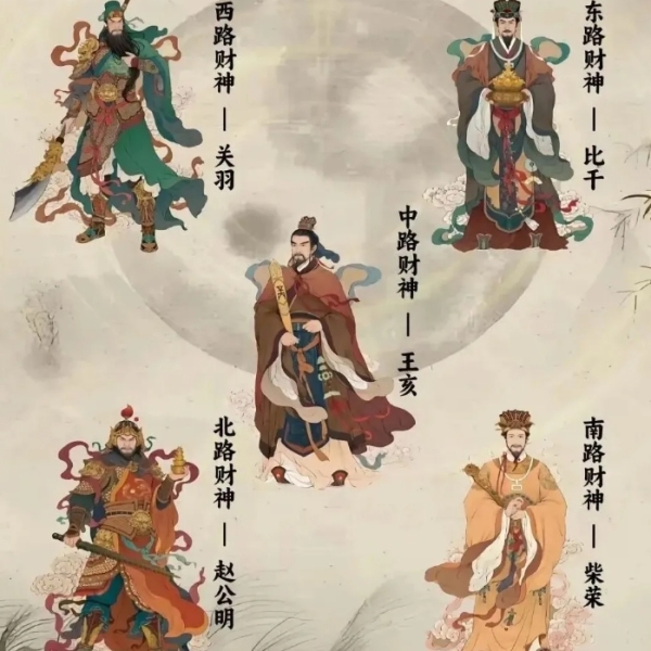 北路财神赵公明:又名赵公元帅,是著名的武财神,管理北路财源。在《封神演义》中被姜太公封为神,常以黑面浓须、骑黑虎、持银鞭和元宝的形象出现,象征着财富与权威。